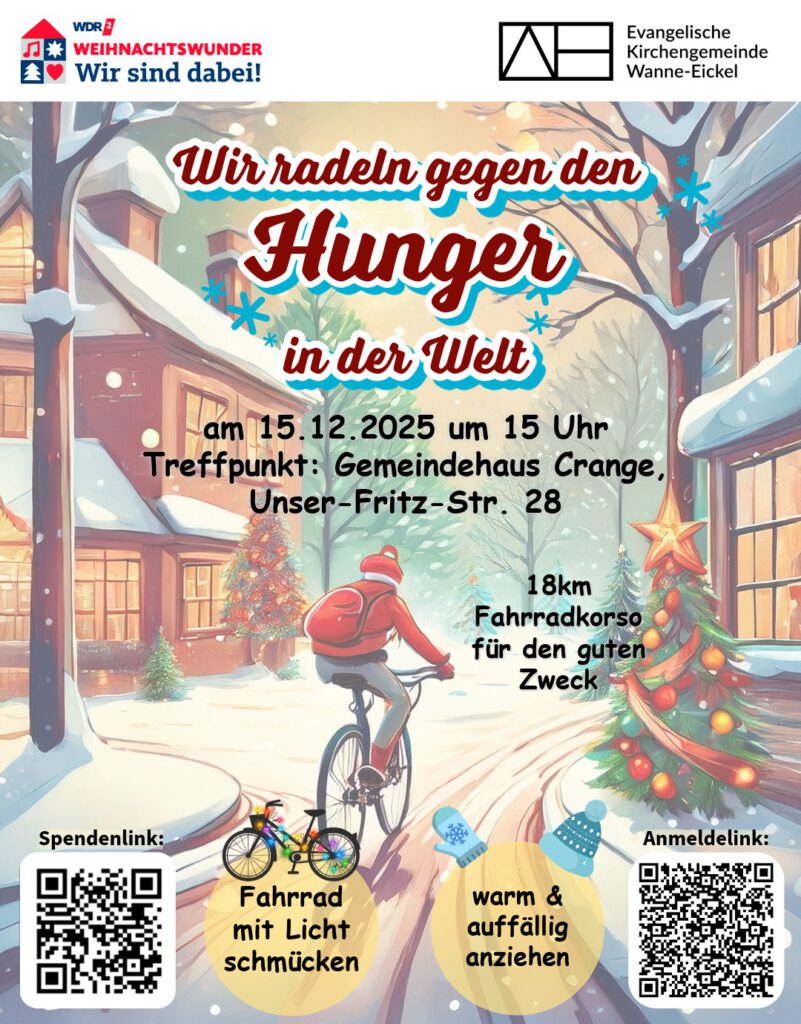 Am 15. Dezember um 15:00 Uhr machen wir uns als Jugendgruppe mit dem Fahrrad auf den Weg zum WDR2 Weihnachtswunder – 18 Kilometer voller Musik, Lichter, Spaß und Gemeinschaftsgefühl. Unsere Fahrt ist Teil einer großen Spendenaktion, bei der wir gemeinsam Gutes tun wollen.